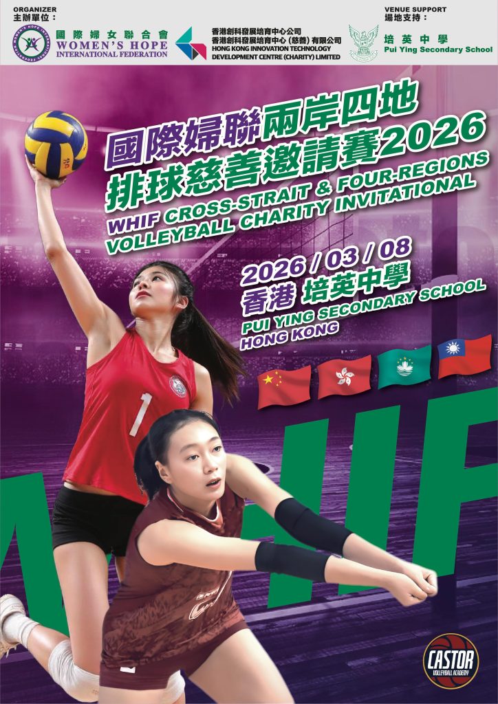 由「國際婦女聯合會」及「香港創科發展培育慈善基金」聯辦之《國際婦聯兩岸四地排球慈善邀請賽2026》我們邀請中國、香港、澳門、台灣四地女子排球隊來港作友誼比試,以排球運動展現女性的堅毅與團結精神希望攜手打出國際舞台。