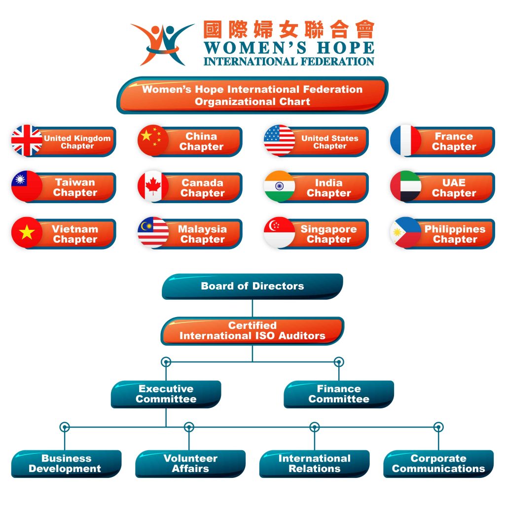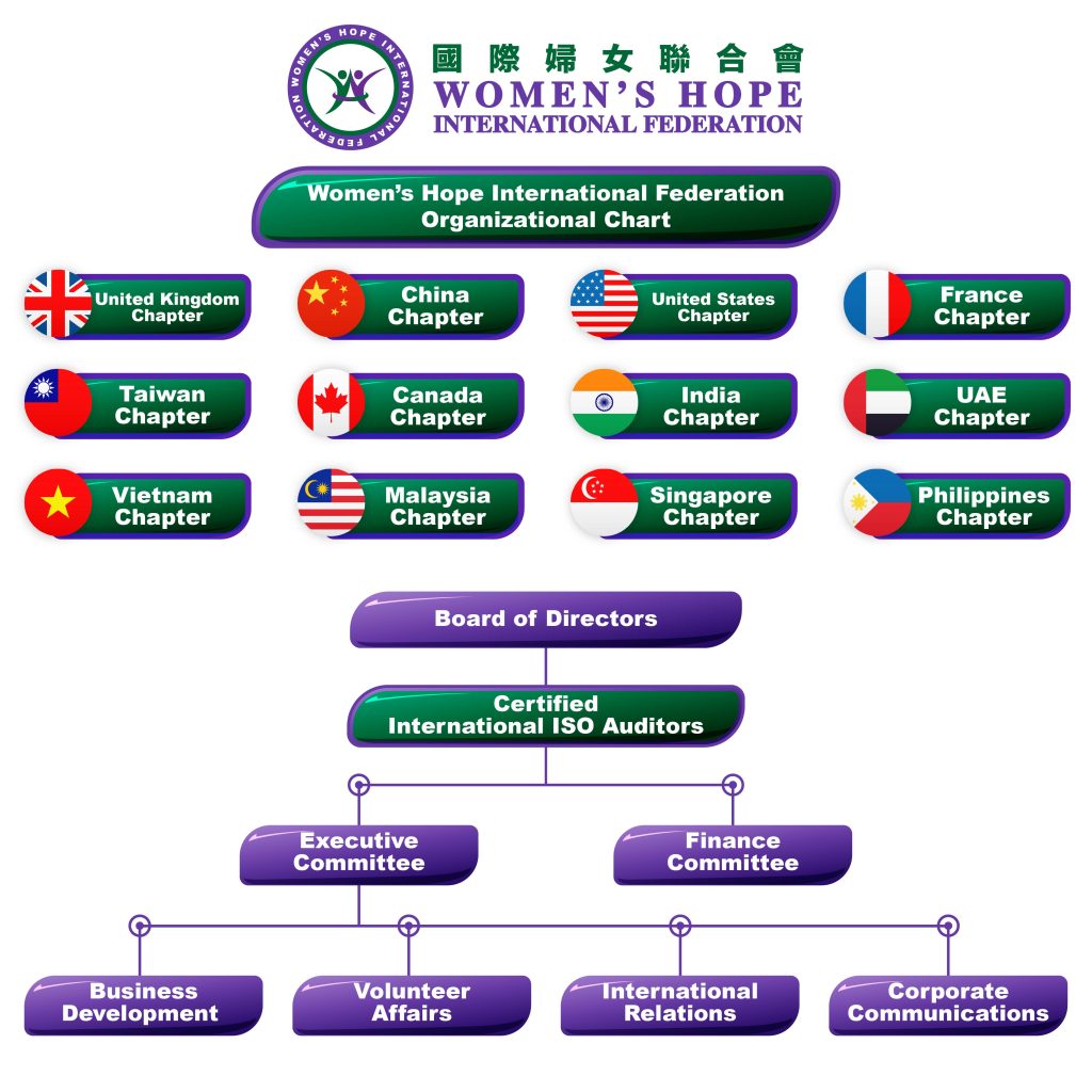 Women’s Hope International Federation (WHIF) is a non-profit organization dedicated to promoting women’s rights and social inclusion globally. The Federation’s service network spans across the globe, with established chapters in the following regions: China, Taiwan, United Kingdom, United States, France, Canada, India, Dubai, Vietnam, the Philippines, Malaysia, and Singapore. Its organizational structure is designed to foster efficient collaboration and cross-regional development, comprising the following key divisions: