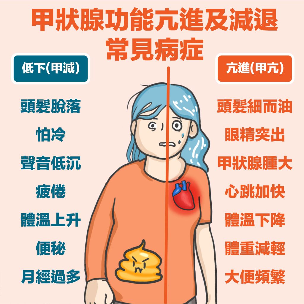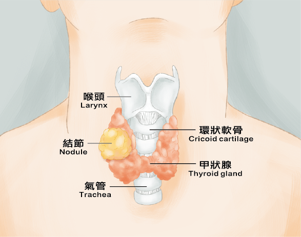 認識甲狀腺疾病 甲狀腺疾病甲狀腺疾病在香港十分普遍,是僅次於糖尿病的第二大常見內分泌系統疾病。30至50歲女性屬於高風險群組。常見的甲狀腺疾病包括甲狀腺功能亢進(甲亢)、甲狀腺功能減退 (甲減)、良性甲狀腺結節及甲狀腺癌,主要與甲狀腺功能異常或結構改變有關。 什麼是甲狀腺?甲狀腺是人體內分泌系統的重要器官,形狀如同展翅的蝴蝶,位於頸部前方下半部,由左葉和右葉組成。它分泌甲狀腺素,負責調節新陳代謝、心臟功能及體溫,並與身體能量、生長發育及各器官運作密切相關。 成因和症狀 甚麼原因會引致甲狀腺疾病?甲狀腺疾病並非單一原因造成,而是免疫系統、遺傳、環境與生活習慣交互作用的結果。主要成因包括:自體免疫疾病:如橋本氏甲狀腺炎 (導致甲減) 及葛瑞夫茲氏病 (導致甲亢),免疫系統錯誤攻擊甲狀腺組織,影響荷爾蒙分泌。碘攝取異常:碘是合成甲狀腺素的原料,缺乏會引起甲減,過量則可能誘發甲亢或甲減。藥物因素:某些藥物如鋰鹽 (Lithium)、心律不整藥物 (Amiodarone) 可能抑制甲狀腺功能。手術或放射治療:接受甲狀腺切除或頸部放射治療的患者,可能因腺體受損而導致甲減。遺傳與環境影響:家族病史、壓力、飲食習慣及病毒感染等也可能增加患病風險。結節或腫瘤:甲狀腺結節或腫瘤可能影響腺體結構,導致功能異常 甲狀腺疾病的常見症狀甲狀腺功能亢進(甲亢)心跳加快、心悸手抖、焦慮、失眠體重下降 (食量正常甚至增加)怕熱、易流汗、體溫升高腸胃蠕動加快,容易腹瀉眼球突出 (常見於葛瑞夫氏病)甲狀腺功能減退 (甲減)新陳代謝減慢,容易疲倦、精神不佳體重增加、怕冷皮膚乾燥、出汗減少水腫、聲音低沉記憶力下降、情緒低落甲狀腺結節或腫瘤初期多無症狀結節增大後可能壓迫氣管或食道,導致呼吸困難或吞嚥困難頸部可觸摸到腫塊其他常見徵兆頸部腫大或疼痛聲音嘶啞 (腫塊壓迫聲帶神經)月經週期不規律或經量異常情緒波動:甲亢易焦躁,甲減易抑鬱 診斷方式 甲狀腺疾病診斷通常是 先由血液檢查判斷功能,再用超聲波檢查結構,必要時進行細針穿刺或核素掃描。若有頸部腫塊或功能異常症狀,應及早就醫檢查。血液檢查:測量促甲狀腺激素(TSH)、甲狀腺素(T4)、三碘甲狀腺原氨酸(T3)等指標,用於判斷甲亢或甲減。甲狀腺超聲波:檢查甲狀腺大小、形態及結構,能發現結節、囊腫或腫塊,並評估其性質。細針穿刺檢查 (Fine Needle Aspiration, FNA):抽取甲狀腺結節細胞,判斷是否為良性或惡性腫瘤。核素掃描:利用放射性碘或其他核素標記,評估甲狀腺功能與結構,常用於甲亢診斷。喉鏡檢查:檢查聲帶活動情況,若懷疑腫瘤壓迫聲帶時會使用。身體檢查與病史詢問:醫生會觸診頸部腫塊、詢問症狀(如心悸、體重變化、吞嚥困難等)。 治療方法 治療策略通常是 先以藥物控制功能,再依結構性問題或腫瘤性質決定是否手術或放射治療。患者多需長期追蹤,部分人需終身服藥以維持荷爾蒙平衡。抗甲狀腺藥物常用於甲亢 (甲狀腺功能亢進),能抑制甲狀腺荷爾蒙分泌。治療通常需持續 18–24 個月,但部分患者停藥後可能復發。放射性碘治療口服放射性碘,藉由血液運送至甲狀腺,破壞部分或全部甲狀腺組織,以降低功能。治療後可能需終身服用甲狀腺素補充劑。手術切除適用於甲狀腺腫大壓迫氣管或食道、懷疑癌變、或嚴重眼疾的患者。術後通常需長期補充甲狀腺素。甲狀腺素補充療法主要用於甲減 (甲狀腺功能低下),透過服用人工合成的甲狀腺素 (如左旋甲狀腺素) 來維持正常代謝。化療或放射治療主要用於甲狀腺癌,依腫瘤類型與分期決定是否需要。